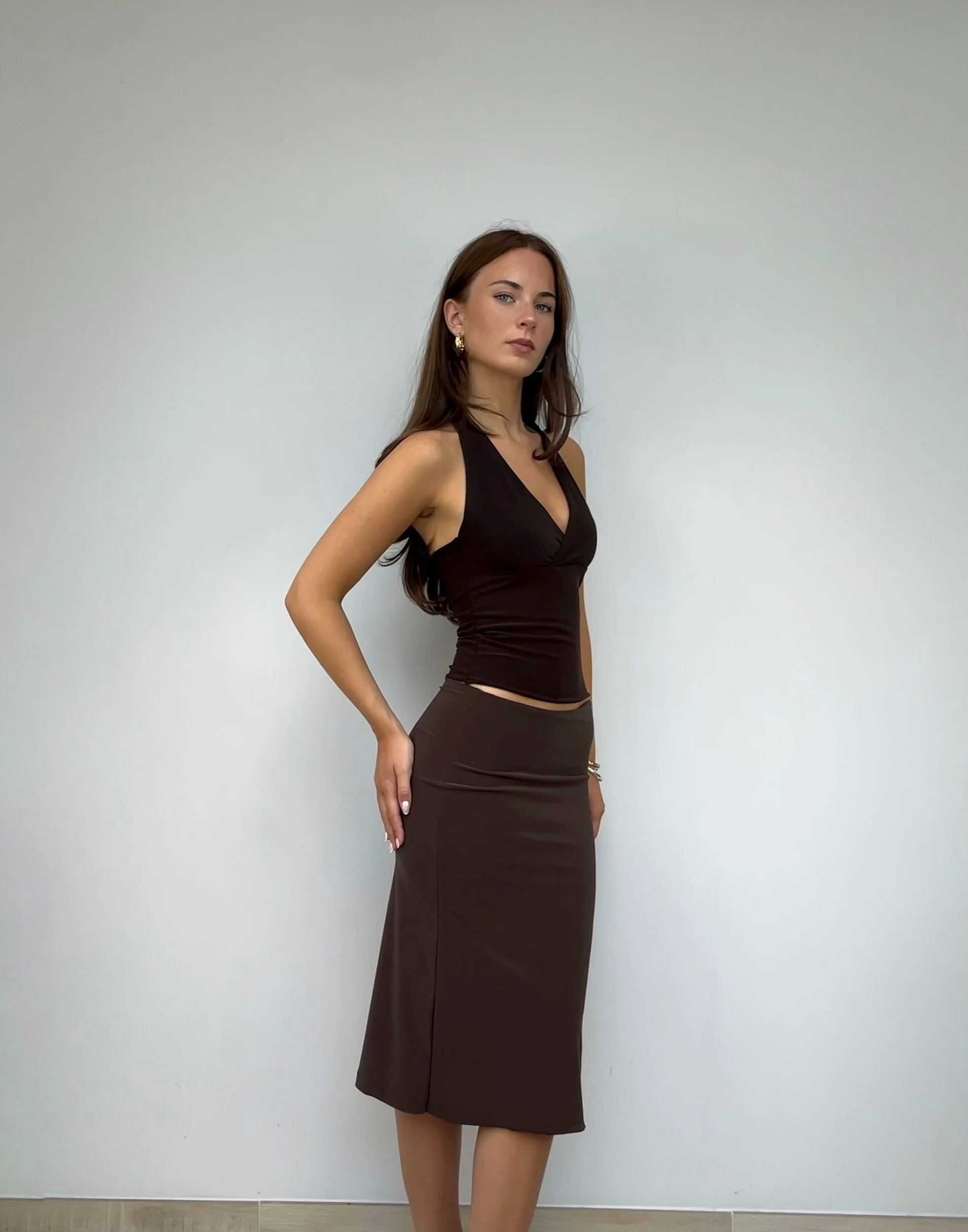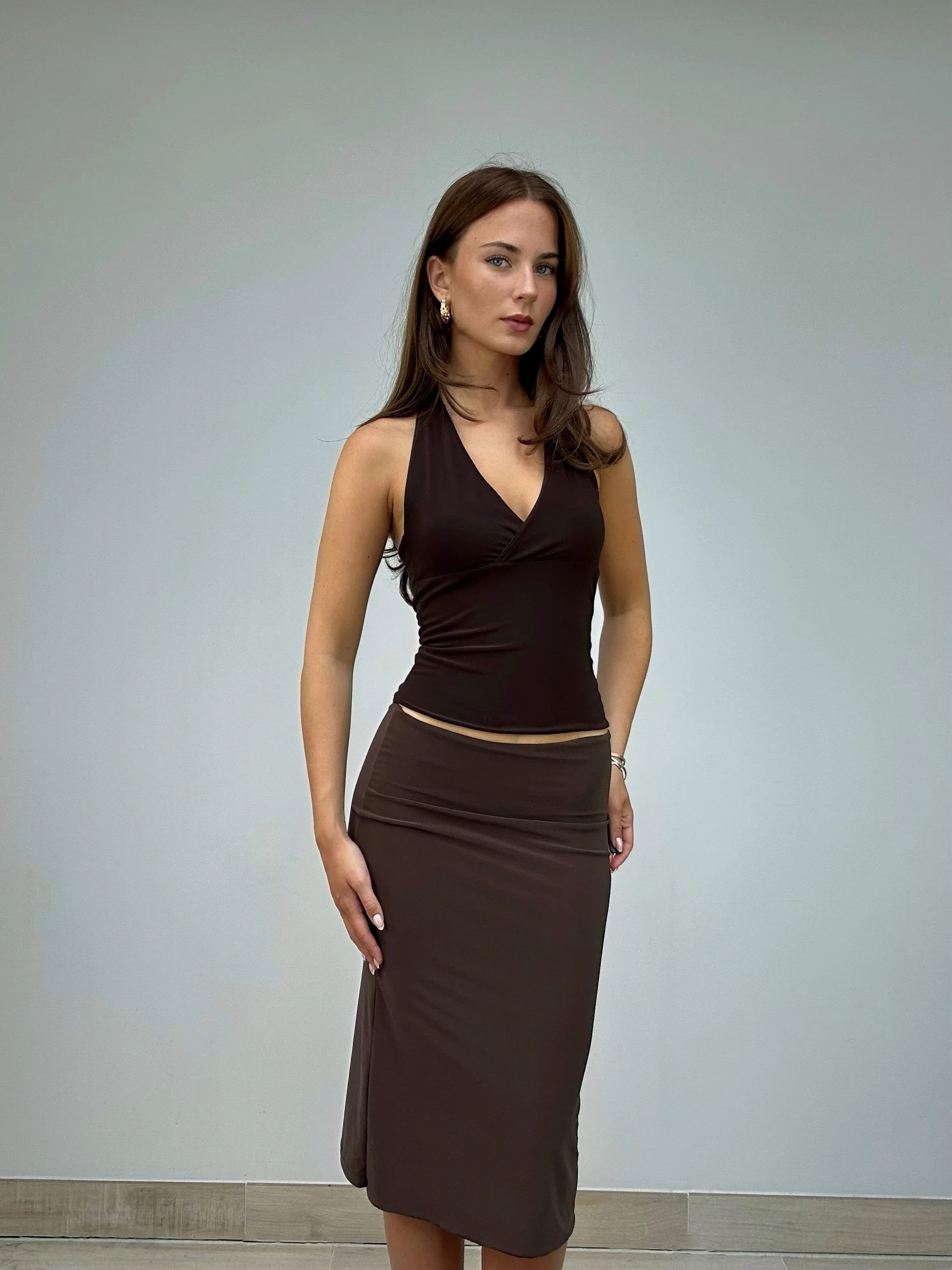 Dark brown low rise midi skirt.